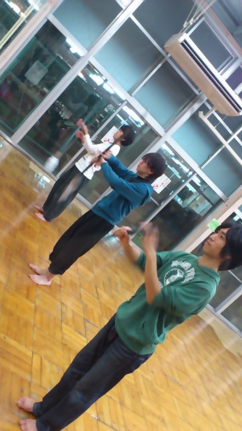 クルクルと鏡に向かって槍を回す3人。