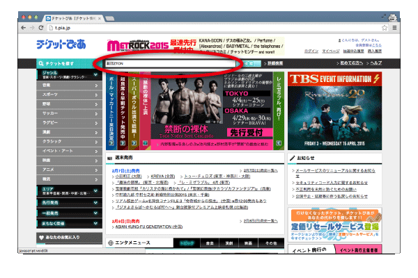 【チケットぴあ】[1]検索バーで「劇団ZTON」を検索します。
