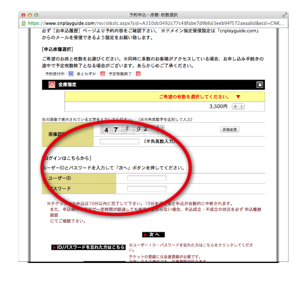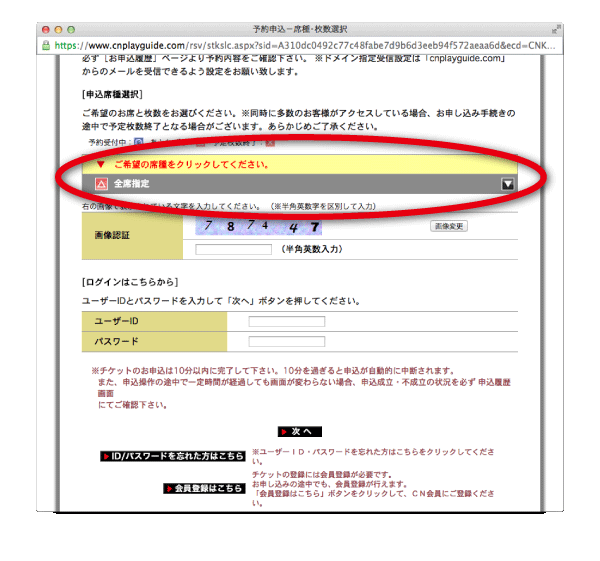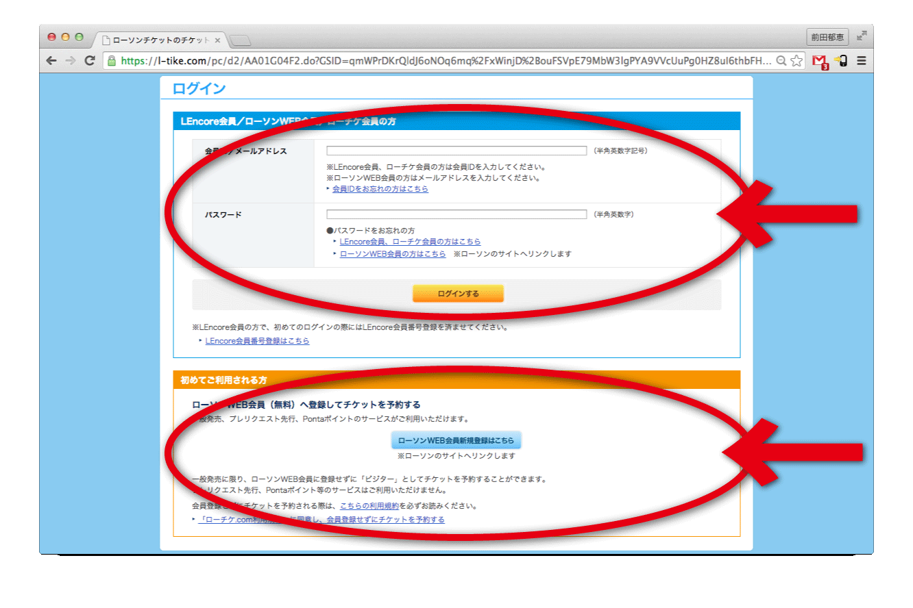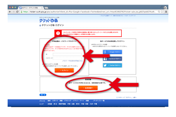 [6]購入画面に行く前に、チケットぴあの会員の方はログインを、会員でない方は新規登録をしていただきます。(会員登録は無料です)
