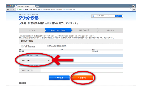 [7]購入画面になったら、支払い方法を選択して確認ボタンをクリックします。