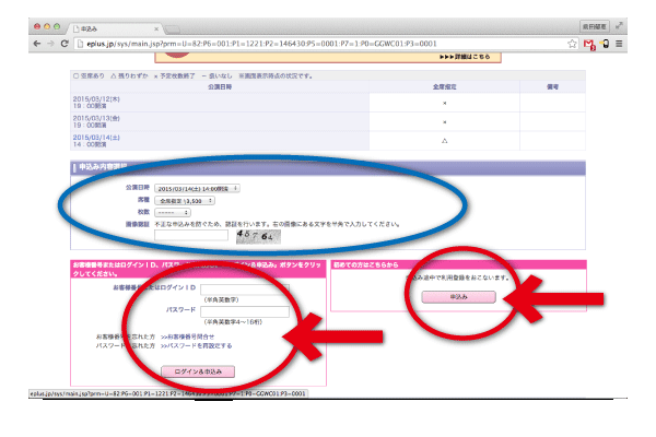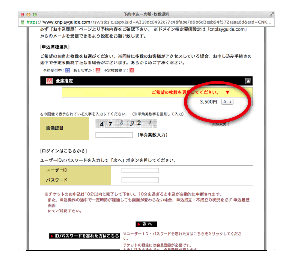 [4]ご希望の日時・チケット枚数を選択したら、会員の方はログイン、会員でない方は新規登録をしてから、購入手続きへ入ります。