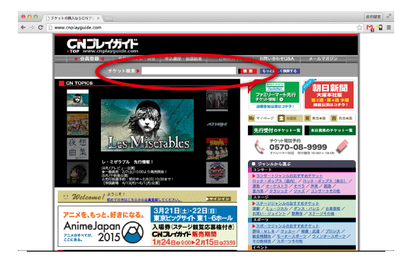 【CNプレイガイド】[1]検索バーで「劇団ZTON」を検索します。